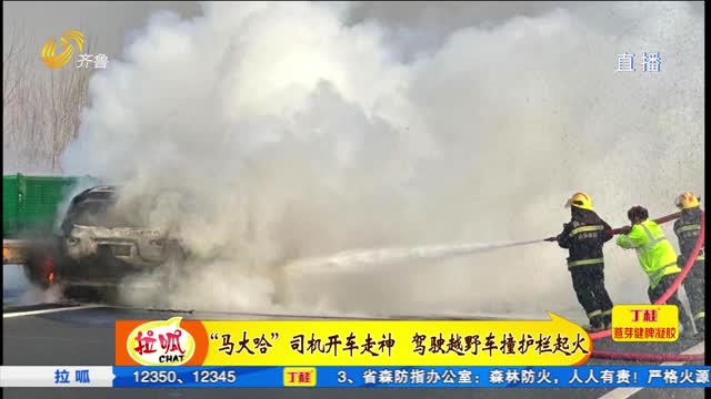 “马大哈”司机开车走神 驾驶越野车撞护栏起火
