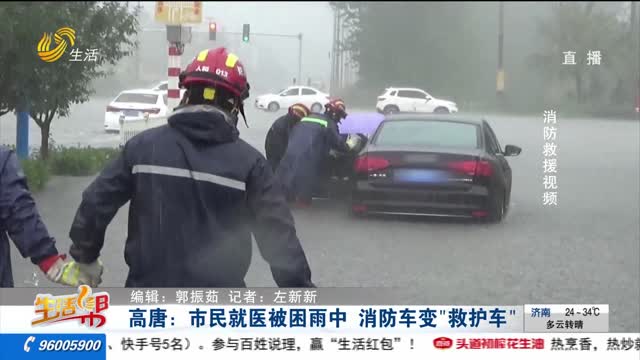 高唐:市民就医被困雨中 消防车变“救护车”