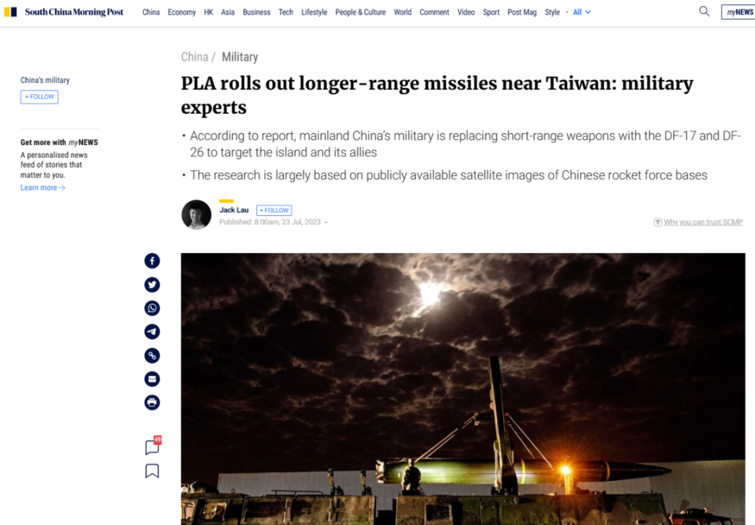 近期美国智库分析公开卫星图像发现,解放军火箭军正在台湾附近广泛部署东风-17高超音速导弹。对此,有国外军事分析师认为:解放军正在使用东风-17等新款导弹替代老旧型号的短程导弹,以获得打击西太平洋外国军事基地和舰队的能力。这名分析师还认为,射程超过3000公里的东风-26攻陆/反舰导弹也正在大量生产,并且已经在沿海省份部署。